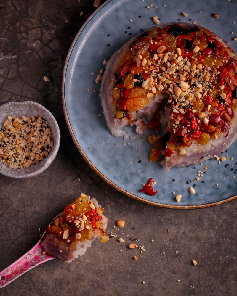 Traditional desserts for Fuzhou Chinese celebrations/festivals/wedding banquets, Ba Bao (Eight Treasures) consist of homemade taro puree, red dates, goji berries, longan, raisins, candied winter melon, sesame peanuts and, of course, sweet glutinous rice. We also know that the old taste is inseparable from pork lard, but in order to meet the tastes of modern young people, we use peanut oil as an alternative, it is also suitable for vegetarian eater.