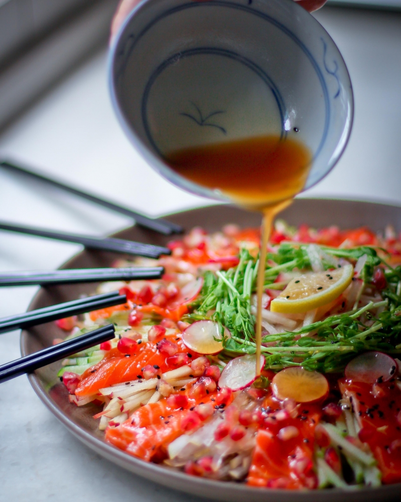 擠入檸檬汁,淋上撈生汁後撒入炸蟹柳芝麻即可